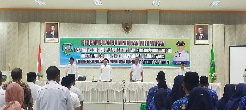Pasaman, —Saiyo News.com-Bupati Pasaman Sabar AS melantik dan mengambil sumpah jabatan kepada 9 Pejabat Eselon III Jabatan Administrator, 15 Pejabatan Eselon IV Jabatan Pengawas dan 9 Fungsional Pengelola Barang dan Jasa dilingkup Pemerintah Kabupaten Pasaman di Aula Lantai III Kantor Bupati Pasaman, Jumat (23 Februari 2024).