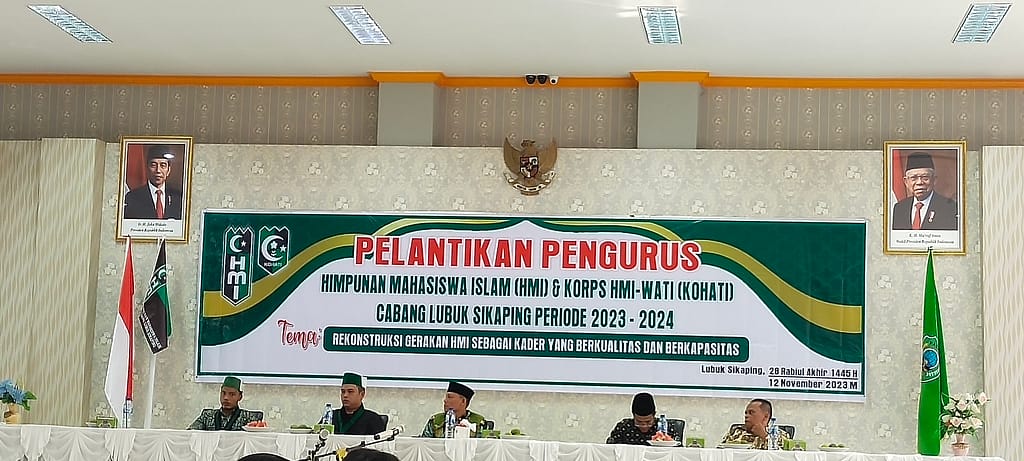 Lubuk Sikaping, – Pelantikan Pengurus Himpunan Mahasiswa Islam (HMI) dan Korps HMI-Wati (Kohati) Cabang Lubuk Sikaping Periode 2023-2024 yang dilaksanakan di Lantai III Kantor Bupati Pasaman dengan suasana khidmat. Pelantikan dihadiri oleh seluruh kader HMI Cabang Lubuk Sikaping, Alumni alumni HMI(KAHMI), Pengurus PB HMI sekaligus melantik pengurus dan tamu Istimewa Plt Bupati Kabupaten Pasaman sekaligus Presidium KAHMI Wilayah Sumbar.
