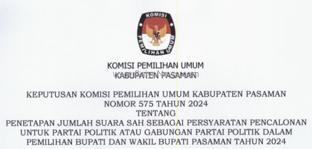 Hai #TemanPemilih, berikut disampaikan Keputusan Komisi Pemilihan Umum Kabupaten Pasaman Nomor 575 Tahun 2024 tentang Penetapan Suara Sah sebagai Persyaratan Pencalonan untuk Partai Politik atau Gabungan Partai Politik dalam Pemilihan Bupati dan Wakil Bupati Pasaman Tahun 2024. Sumber: KPU Pasaman