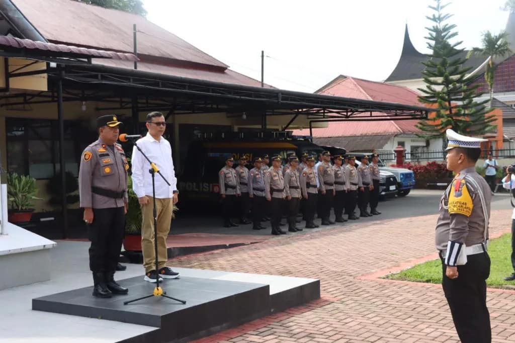 Kapolres Pasaman AKBP Yudho Huntoro diwakili Wakapolres Kompol Muddasir didampingi oleh Bupati Pasaman diwakili Asisten I Teddy Marta memimpin Apel Gelar Pasukan Operasi Ketupat Singgalang 2024.