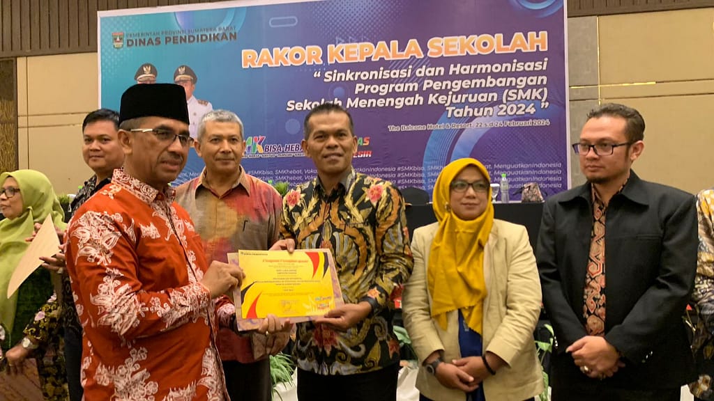 Bukitinggi, — SMKN 1 Lubuk Sikaping telah meraih penghargaan dalam kategori “Amat Baik” untuk penyusunan dan implementasi Kurikulum Operasional Satuan Pendidikan (KOSP) Tahun Pelajaran 2023/2024. Penghargaan ini diserahkan langsung oleh Kepala Dinas Pendidikan Provinsi Sumatera Barat, Bapak Drs. Barlius, M.M., kepada Kepala SMK Negeri 1 Lubuk Sikaping, Bapak Muslim, M.Pd. Acara pemberian penghargaan berlangsung pada tanggal 22 Februari 2024, di The Balcone Hotel & Resort Bukittinggi.
